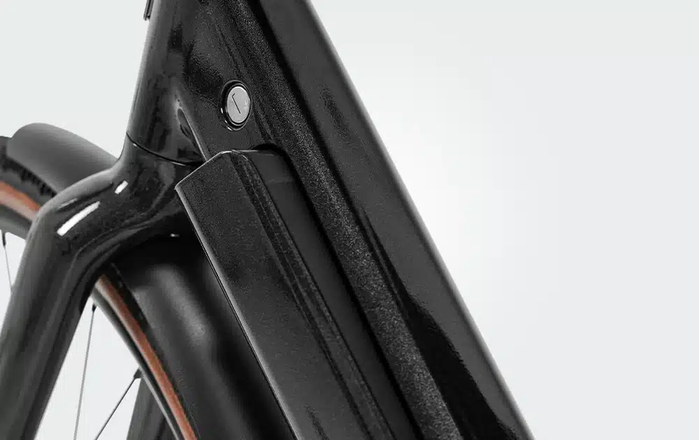 Das Turmali mit seinem sportlich-ausgewogenen Rahmen mit ’smooth-welding‘ aus 6061er Aluminium: elegant schlank und doch, stabil und robust. Die Kablefuehrung am Lenker ueber den Rahmen hinaus, in den Hinterbau, ist mehrheitlich integriert so wie auch der ‚versteckte Akku‘ im Unterrohr. Das Vorbaurohr des Rahmens geht smooth nahtlos über in den modernen Integral-Vorbau (goose-neck). Es gibt einige vorgefertigte Gewinde am Rahmen für die Anbringung von Zubehör.