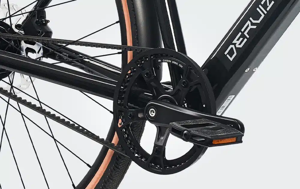 Hohe Laufleistung, das bietet der Gates Carbon Riemen. Der Belt Drive (CDN) ist wartungsfrei. Er verstärkt den urbanen Charakter des Turmali. Kein dreckigen Hosen, kein Ölen, aber eine saubere Fahrt. Durch den Drehmoment-Sensor in der Tretachse integriert wird Ihr Akku länger halten also sonst. Sichtbar hier auch die gute Kabelintegration am Vorbau unten.