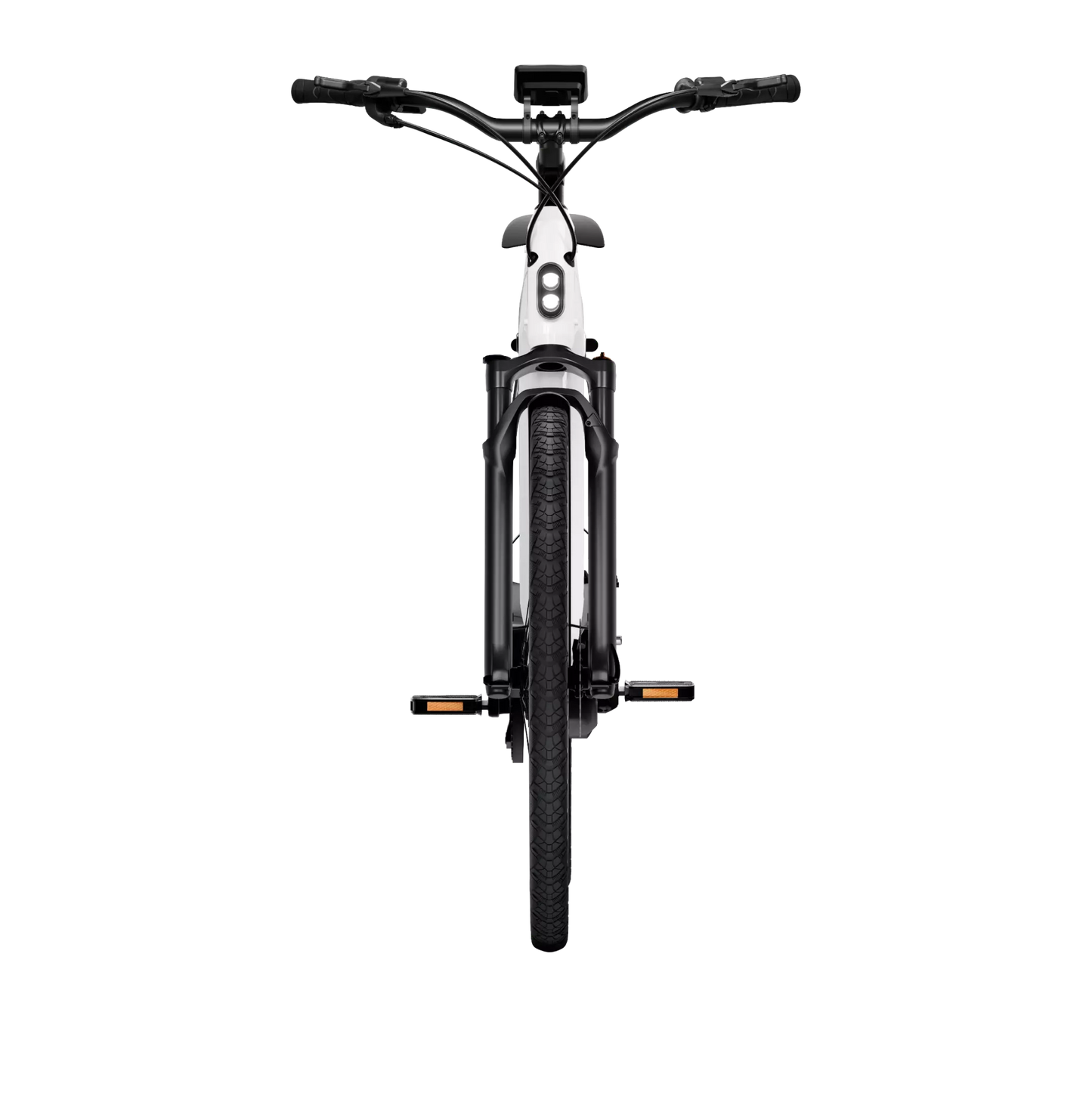 Eine gefederte Vorderradgabel gleicht Unebenheiten souverän aus. Hydraulische Scheibenbremsen sorgen für zuverlässige Verzögerung und volle Kontrolle – auch bei Nässe oder im dichten Verkehr.